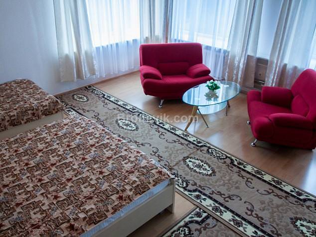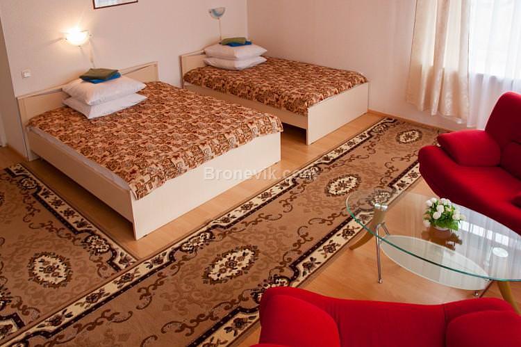 2 комнатный номер, в номере кухня, холодильник, ТВ, посуда, чайник, фен, халат, душевая кабина, джакузи, мягкая мебель, двуспальная кровать и полутороспальная кровать