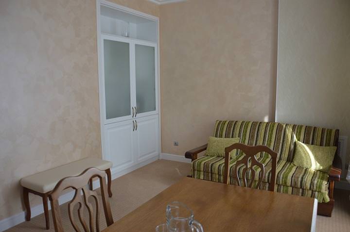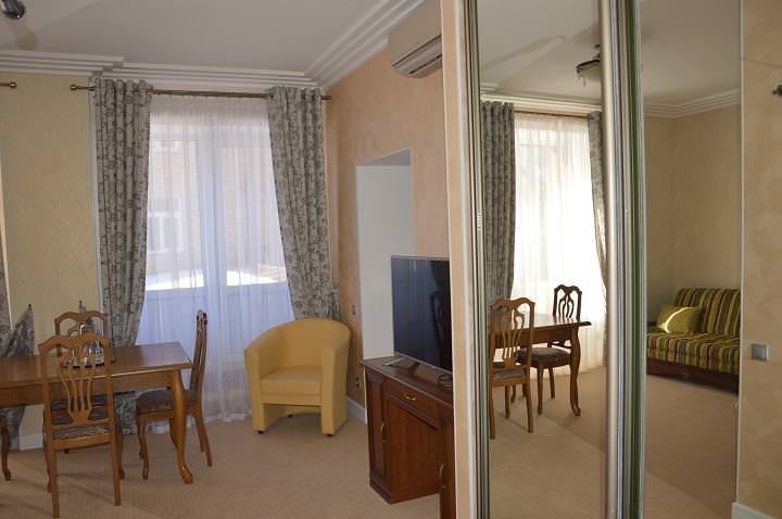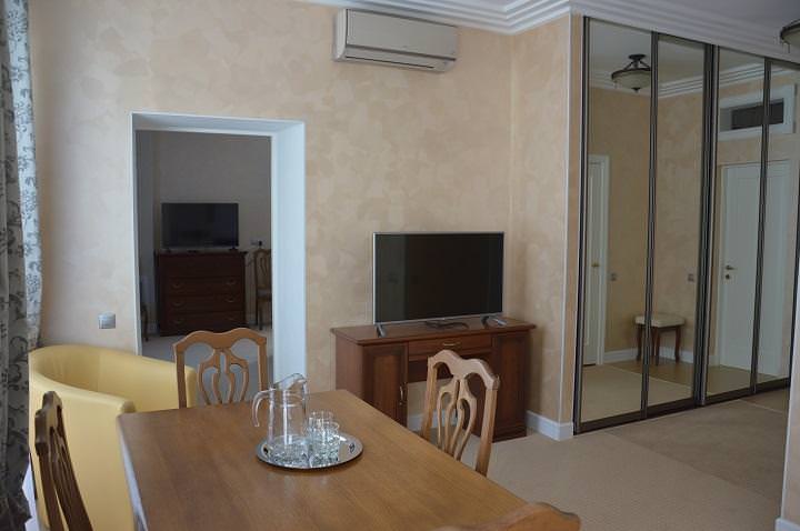 2 комнатный номер. В номере кухня, холодильник, ТВ, посуда, чайник, фен, халат, душевая кабина, джакузи, мягкая мебель, двуспальная кровать